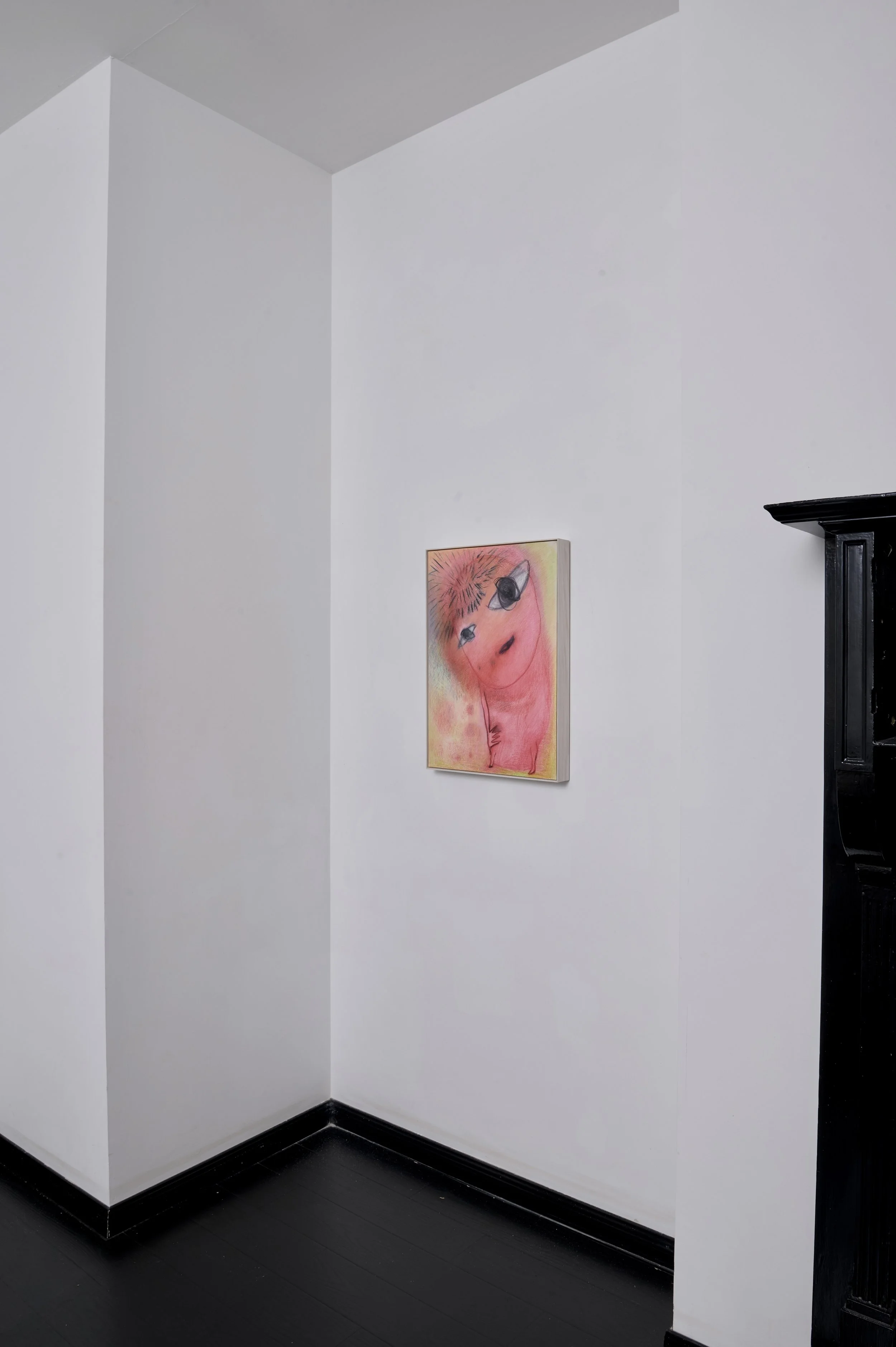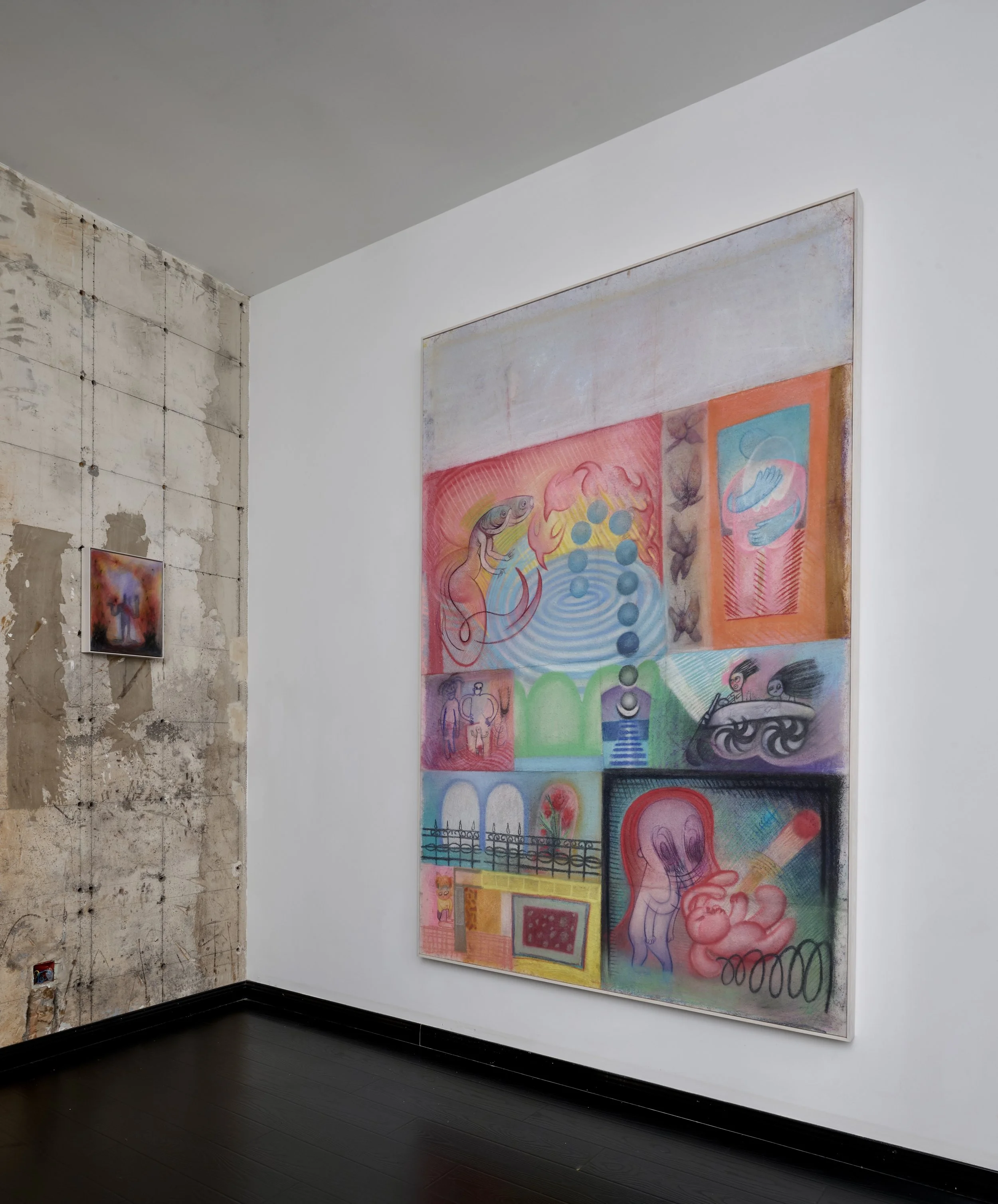 CHAPTER 6 is honored to present artist Gu Fangyuan’s debut solo exhibition: Spiritual Anchor Point. Gu Fangyuan’s artistic practice revolves around the concept of the “interconnectedness of all things.” Through her experiences and observations of the natural world and everyday life, the artist seeks to uncover a spiritual connection—equal and pure—between herself, space, and all living beings. These connections manifest in unguarded moments, through the emotional and energetic exchanges between individuals. Gu Fangyuan captures and records these unspoken messages and fleeting sensations, distilling them into vivid, tangible imagery through spontaneous, site-specific creations. Her works depict surreal scenes where humans, animals, and plants coexist within specific spaces, often exuding a primal sense of ritual, occasionally accompanied by a childlike, bittersweet humor.